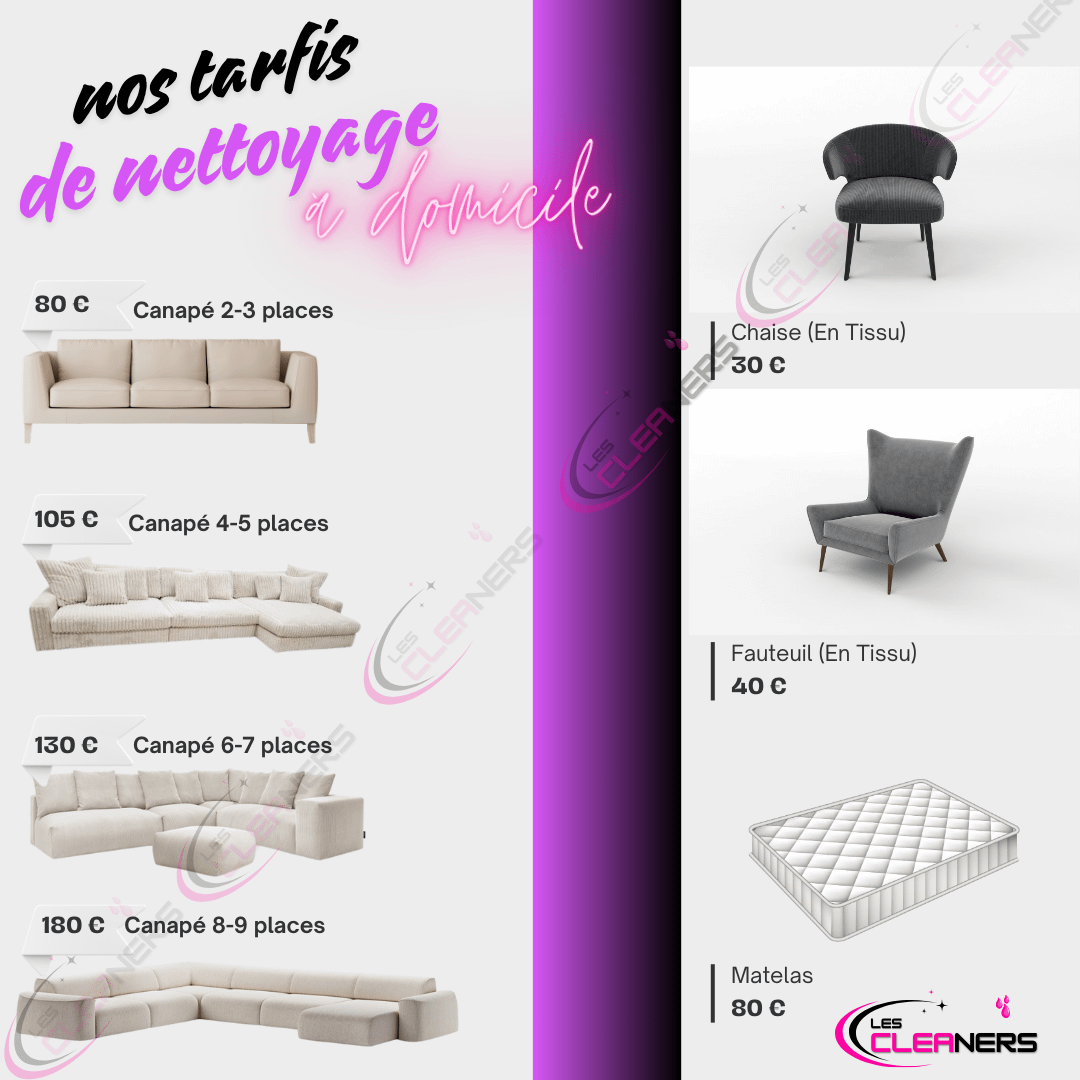 Chez Les Cleaners, nous sommes spécialisés dans le nettoyage professionnel de canapés, fauteuils, matelas et tapis. Nous éliminons efficacement les taches, auréoles, mauvaises odeurs, acariens et microbes, quel que soit le degré de saleté de votre canapé. Grâce à notre méthode par injection-extraction et à l’utilisation de produits professionnels de haute qualité, nous nettoyons et assainissons vos tissus en profondeur sans les abîmer.